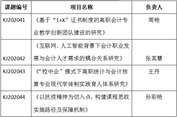 经学校推荐,中国商业会计学会专家评审,我校周艳、张其慧、王丹、孙彩艳四位老师申报的4个项目获中国商业会计学会2020年度研究课题立项。根据中国商业会计学会文件《关于公布2020年度课题立项的通知》(中商学字〔2020〕34号),我校立项名单如下: