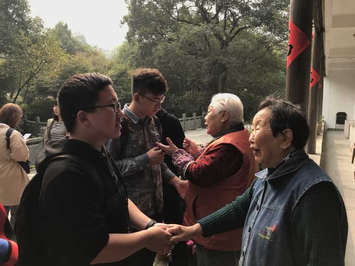 老人们与学生热情聊天
