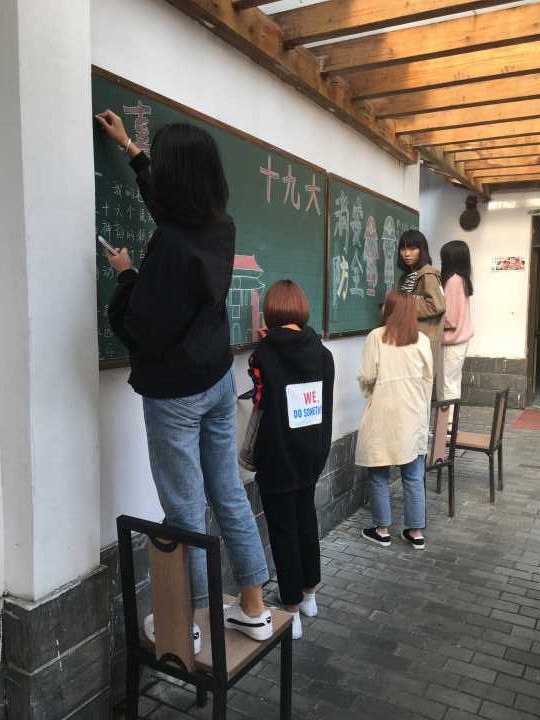 为老人出黑板报,展示十九大会议内容及消防安全知识