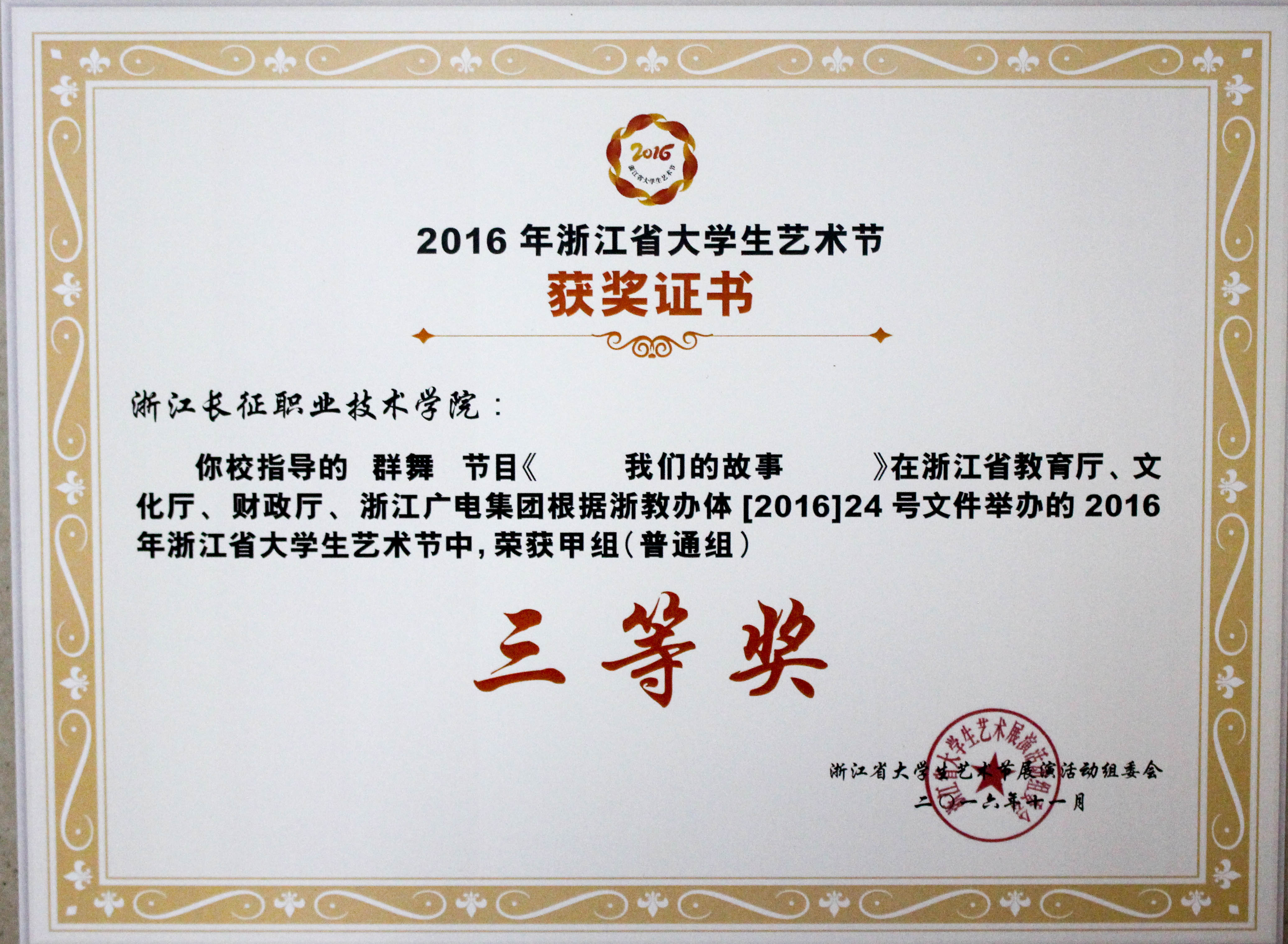 在省教育厅、省文化厅、省财政厅、浙江广播电视集团共同主办的2016年省大学生艺术节中,我院选送的小品《感恩》荣获戏剧类甲组三等奖;群舞《New force》、《恋人心》、《我们的故事》等3个节目荣获舞蹈类甲组三等奖。(团委供稿)